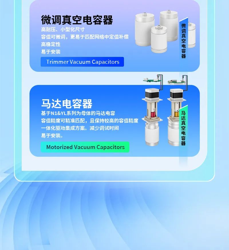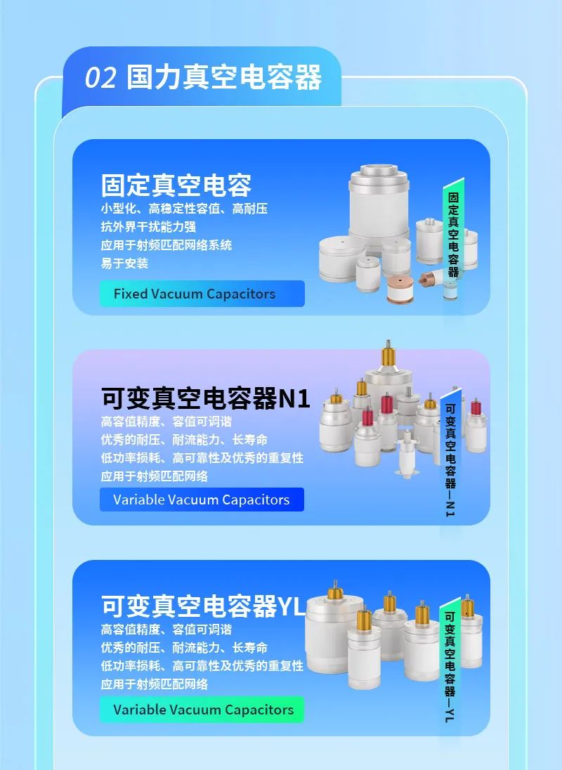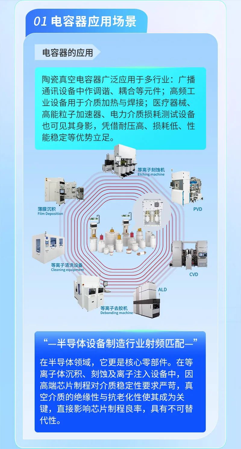 国力股份真空电容器半导体应用场景陶瓷真空电容器广泛应用于多行业:广播通讯设备中作调谐、耦合等元件;高频工业设备用于介质加热与焊接;医疗器械、高能粒子加速器、电力介质损耗测试设备也可见其身影,凭借耐压高、损耗低、性能稳定等优势立足。 等离子刻蚀机