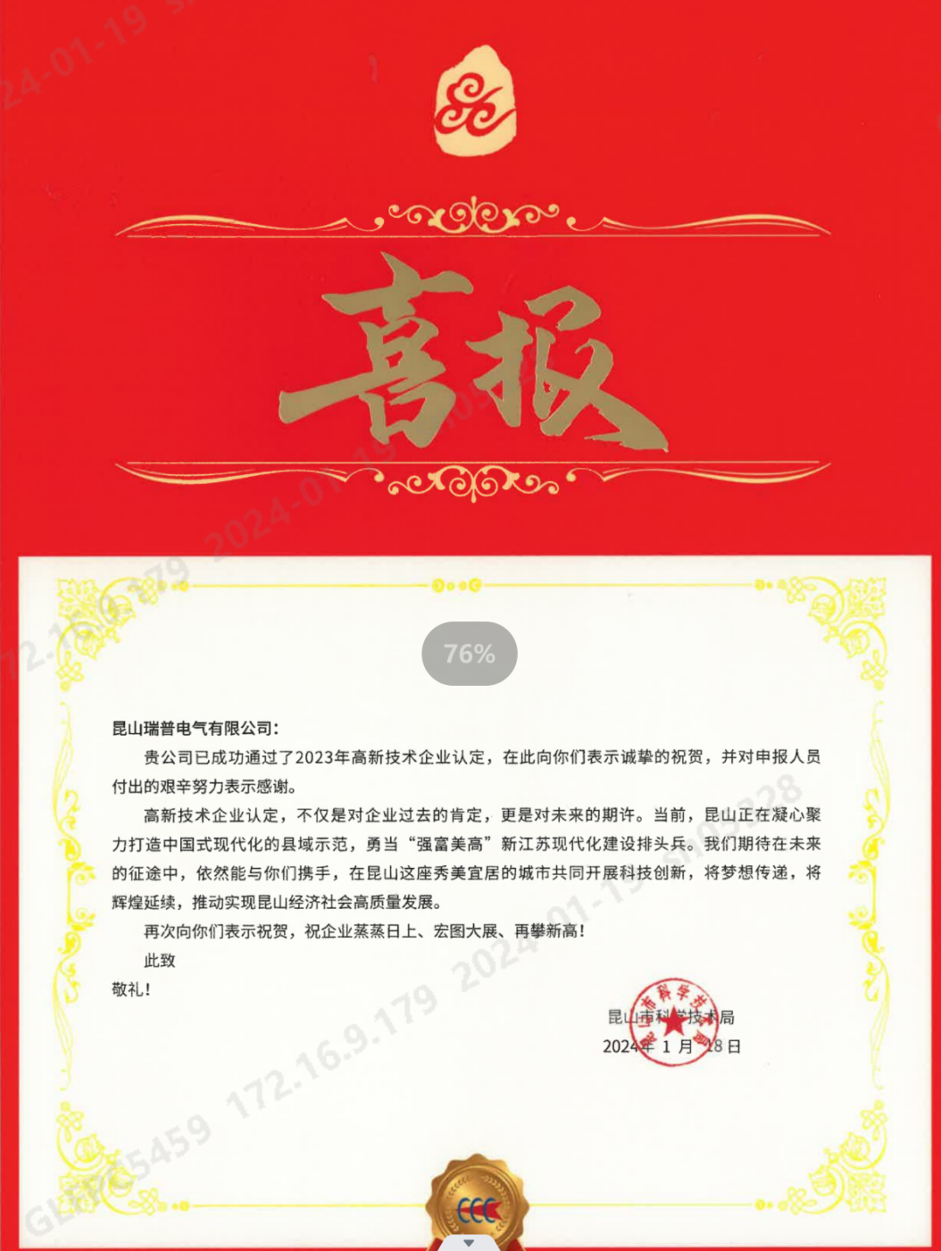 2023年底,全国高新技术企业认定管理工作领导小组办公室发布了《江苏省认定机构2023年认定报备的第二批高新技术企业备案公示名单(昆山)》,国力股份子公司——昆山瑞普电气有限公司位列其中,顺利通过高新技术企业认定。