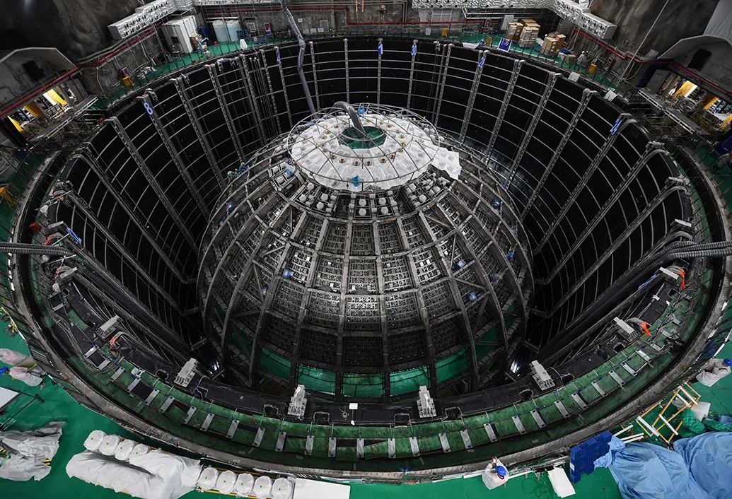 中微子是宇宙中最古老、最神秘的基本粒子,其研究对理解宇宙模型、人类生存的物质世界等都具有重要意义,是国际最前沿的基础研究。江门中微子实验以测量三种中微子质量顺序为首要科学目标,其核心探测设备位于地下实验大厅内44米深的水池中央,它由直径41米的不锈钢网壳、直径35.4米的有机玻璃球,以及2万吨液体闪烁体、45000只光电倍增管等关键部件组成。